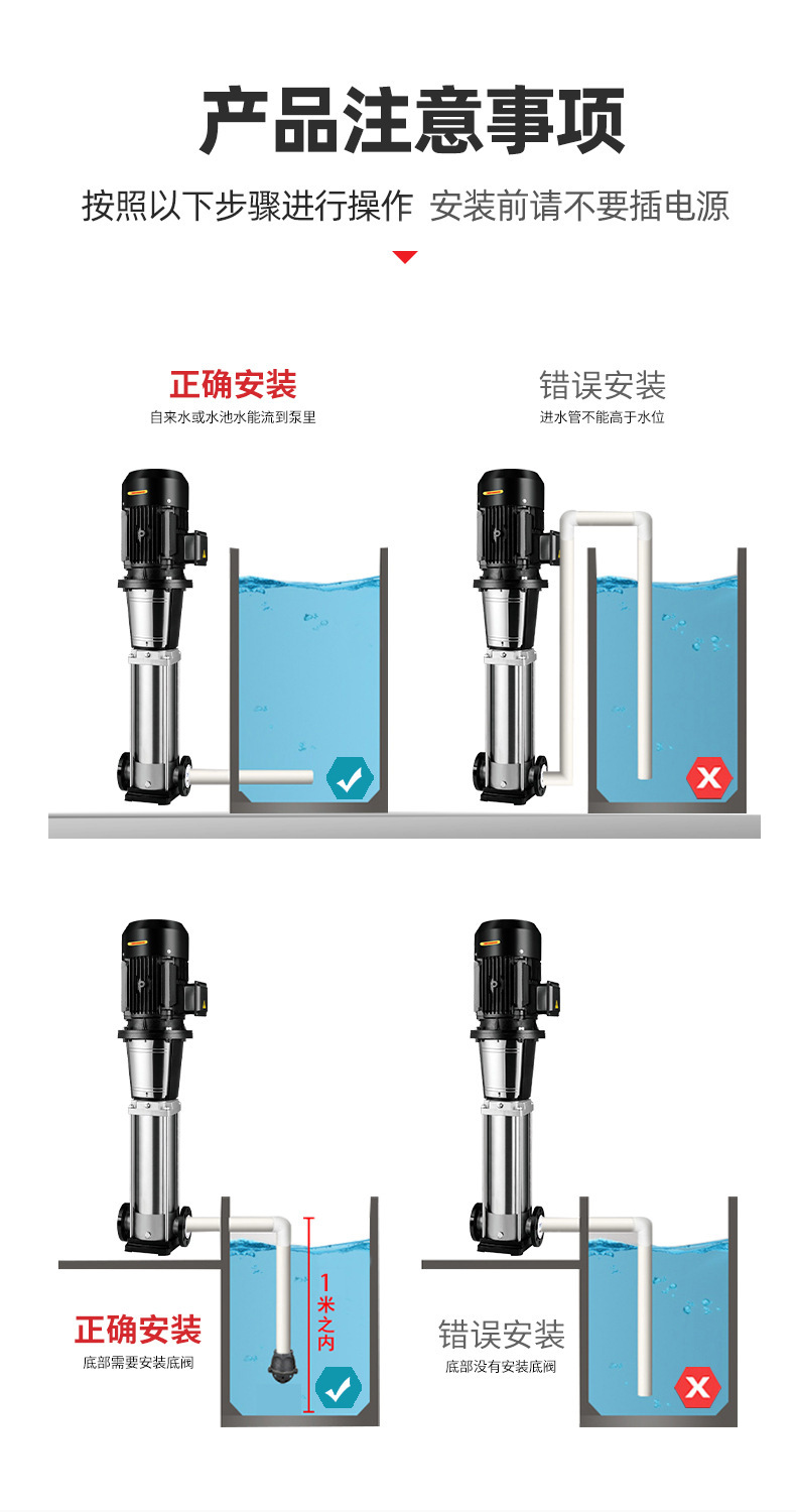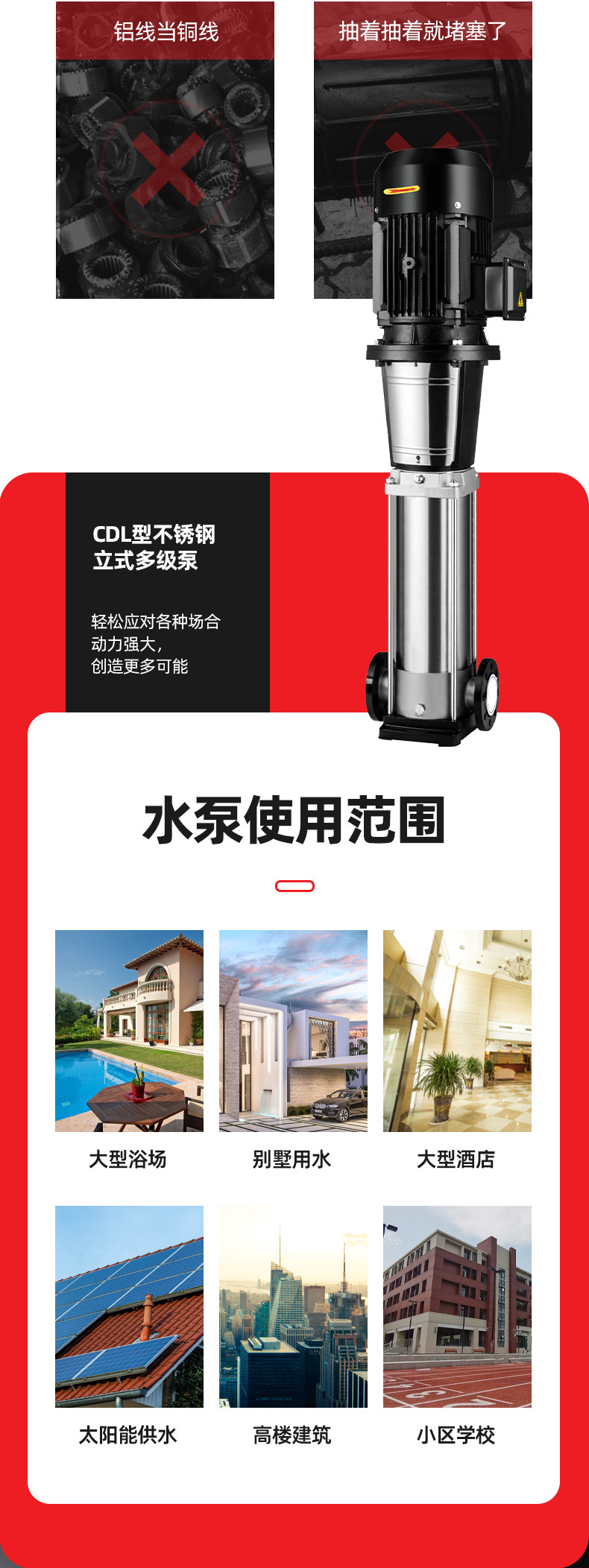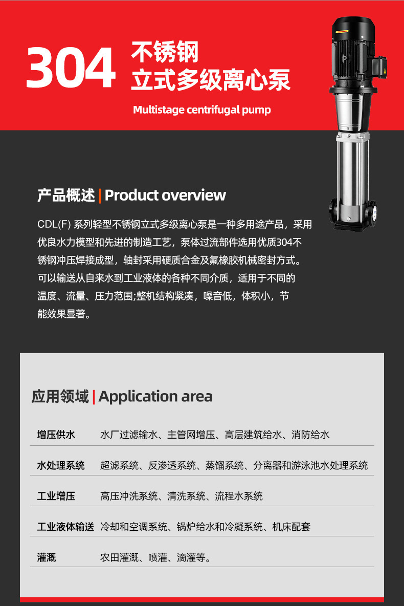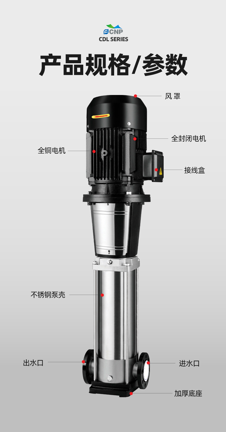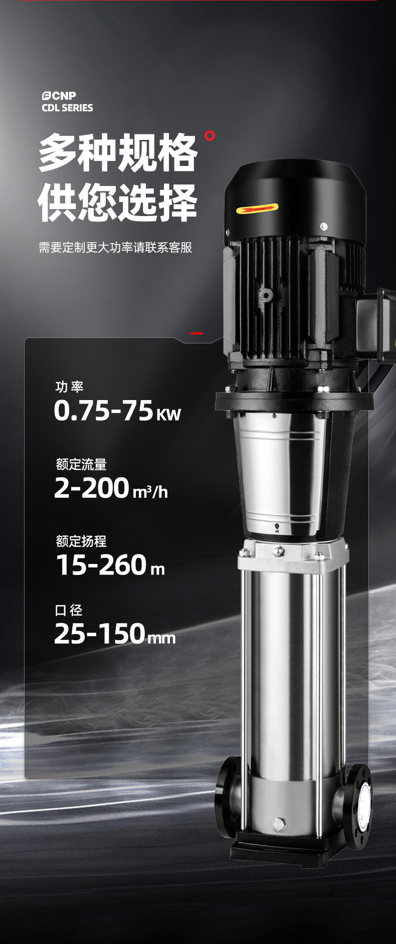 南方CDL,CDLF非自吸輕型立式多級離心泵,電機軸通過聯(lián)軸器直接與泵軸聯(lián)接,葉輪導葉采用不銹鋼板沖壓焊接或不銹鋼精密鑄造制成,泵進出水口在泵底同一直線上(可配IEC或NEMA電機)。