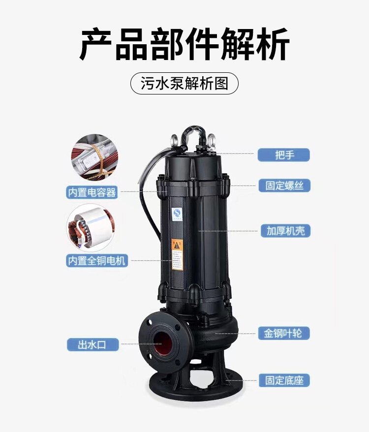 產(chǎn)品說明:南方wq污水污物潛水電泵由電機與泵兩部分組成,兩者通過油室及機械密封組件隔開,分固定式自動耦合安裝和移動安裝。