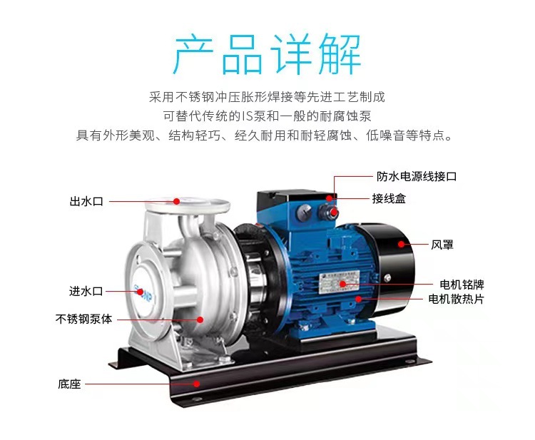 產(chǎn)品說(shuō)明:南方zs不銹鋼臥式單級(jí)離心泵,泵體采用不銹鋼板沖壓脹形焊接工藝制成,可替代傳統(tǒng)的is泵和一般的耐腐蝕泵,軸向入口和徑向出口。