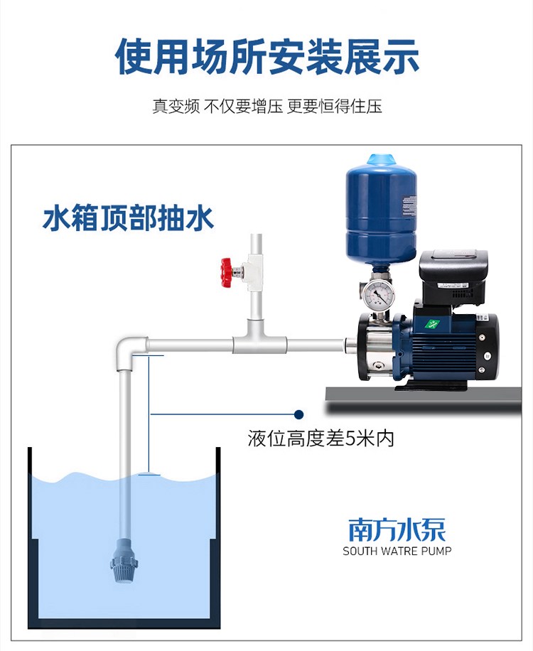 南方CHME系列臥式智能恒壓變頻泵采用了變頻調(diào)速及自動(dòng)化控制相結(jié)合的技術(shù),配合高效節(jié)能的CHM非自吸輕型臥式多級(jí)離心泵。整機(jī)主要由CHM泵、控制器、傳感器、壓力罐、五通止回閥及軸向抗震壓力表等組成。具有性能穩(wěn)定、高效節(jié)能、全自動(dòng)智能控制、低噪音、耐腐蝕、結(jié)構(gòu)緊湊、外形美觀、體積小、重量輕等特點(diǎn)。